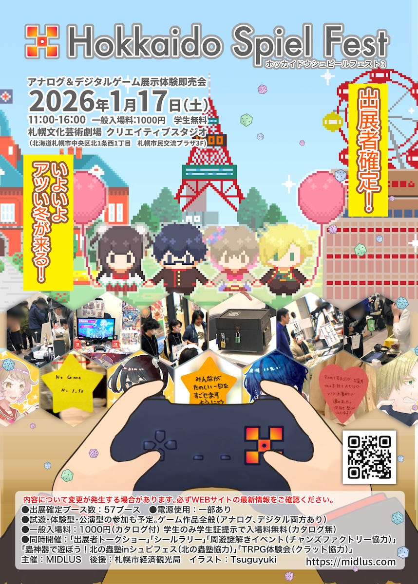 札幌ではアナログゲーム、デジタルゲーム、TRPGなどを幅広く扱う展示即売会の『ホッカイドウシュピールフェスト』が定期的に開催されています。来月1月17日に開催で、『M.O.Q.R. Company』開発チームもサークル名「イモタベルカ」として出展しています。