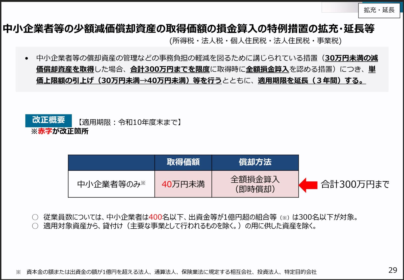 今回の改正案には、いくつかの留意点があります。まず、本制度による即時償却の年間合計限度額(300万円)については、現時点では変更の記載はありません。複数のPCを一度に導入する場合は、合計額に注意が必要です。また、対象となる法人の要件が一部厳格化され従業員数が500人から400人となりましたが、インディーゲーム開発者にとっては影響はありません。