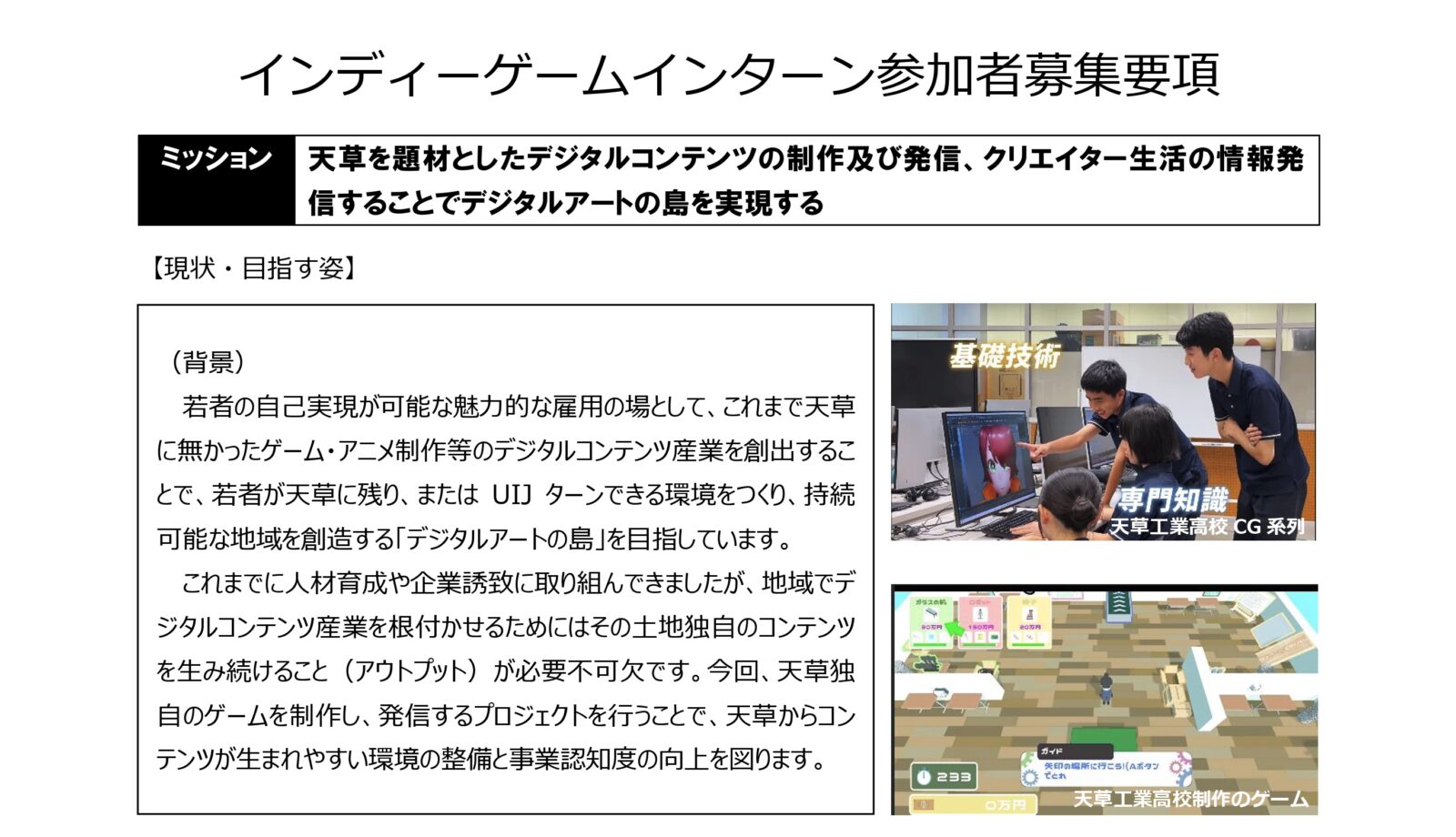 天草市は、2026年10月1日から地域おこし協力隊(任期最大3年)の採用も予定しています。今回のインターンシップで制作されたコンテスト作品は、この地域おこし協力隊の審査において加点対象となります。地域おこし協力隊の業務としては、インディーゲーム開発のほか、天草工業高校ゲーム部の講師やクリエイターコミュニティの形成などが想定されています。