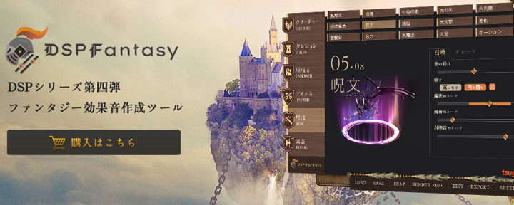株式会社Tsugiが、効果音生成ソフトウェア「DSP」シリーズの新作「DSP Fantasy」をリリースしました。製品名どおり、中世ファンタジーをテーマとした作品に生かせる効果音を作るのに適したツール...